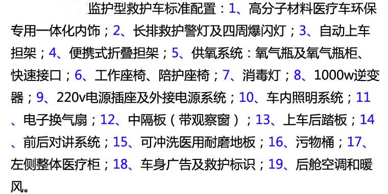 | 其它 | 1.車內裝置藥柜、擔架、氧氣瓶、輸液掛鉤等專用裝置;2.隨底盤選裝中頂時整車高度為2490mm;隨底盤選裝高頂時整車高度為2875mm;3.ABS系統控制器型號:APG3550500G;ABS系統控制器生產企業:浙江亞太機電股份有限公司;發動機最大凈功率83KW;4.隨底盤選裝后踏步板,對應整車長度為5696mm,不選裝后踏步板時對應整車長度為5496mm;隨底盤選裝輪罩蓋,選裝前霧燈,選裝黑色前大燈;6.車身可選裝爆閃燈.車頂可選裝圓柱形爆閃燈. | ||