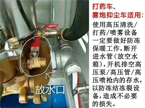 冷空氣來了,北方地區氣溫突降,會出現嚴重冰凍,使用抑塵車的客戶朋友們一定要做好防凍保暖工作,斷開進水管(放空水箱),開機排空高壓泵/高壓管/高壓噴槍內的存水,以防凍結凍裂設備,造成不必要的損失。冷空氣來襲!提醒各位水車用戶,晚上整車灑水開關、水泵開關、球閥開關打半開狀態放水,第二天用車時需加引水,檢查水箱防凍液是否充足!