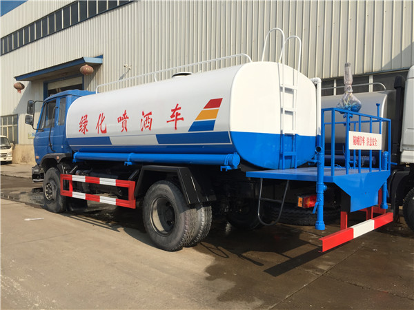 東風153灑水車改裝配置:罐體采用4MM厚武鋼專用容積板制作,實際容積15立方,前沖后灑側噴,高位花灑,后工作平臺及綠化高炮,配專用水泵(泵進泵出)及消防栓接口,兩根等長輸水管,金屬漆,其余標配。用戶可選裝消防大功率消防水泵、應急時可做消防灑水車使用。