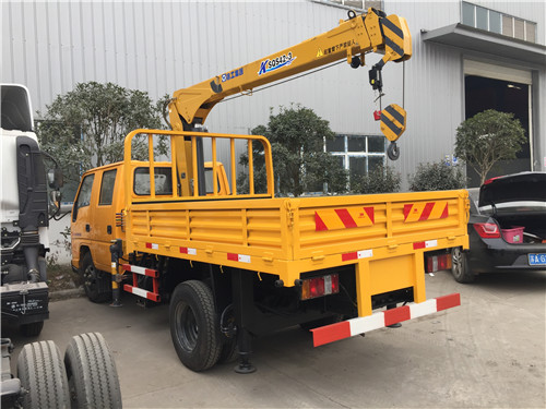 藍牌雙排隨車吊江鈴雙排隨車吊直臂式起重機型號,額定起升質量及重量為(Kg):SQS22:1100,600, 折臂式起重機型號,額定起升質量及重量為(Kg):SQZ32:1050,600. 側,后防護裝置為金屬護欄,材質Q235,連接方式:螺栓連接,斷面尺寸:100mm×45mm,離地高度:500mm。僅適用發動機JX493ZLQ5油耗值為11.1,發動機JX493ZLQ5A油耗值為11.20.選裝欄板結構。選裝折臂式起重機,選裝駕駛室形式。選裝防護欄連接方式為焊接。ABS系統型號:APG3550500A,ABS系統生產廠家:浙江亞太機電股份有限公司
