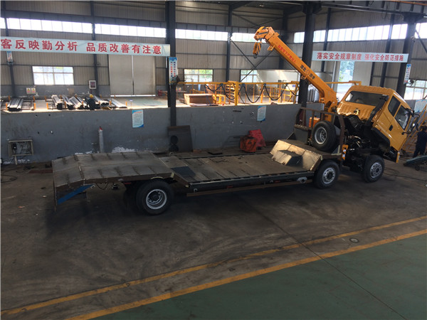 東風前四后八凹梁隨車吊,前四后八凹梁隨車吊采用凹梁下沉結(jié)構(gòu)好處在于平板離地高度低重心穩(wěn),專利凹式設(shè)計,凹梁式隨車吊平板車,凹式隨車吊平板車,主要用于30噸左右挖掘機運輸,裝載機運輸,收割機運輸,壓路機運輸?shù)裙こ虣C械和不可拆卸物體的運,本產(chǎn)品是我們廠家專利產(chǎn)品,全國有此公告僅此一款,缺點在于凹梁設(shè)計易斷大梁和前方向拐臂,采用TT530豪華活D913駕駛室,玉柴310馬力國五發(fā)動機,5.5噸前橋13噸后橋,法士特10檔變速箱,10.00R20鋼絲胎,方向助力、斷氣剎、abs防抱死、空調(diào),總質(zhì)量31噸,上戶噸位18.45噸,車身自重12.35噸,標準型上裝橫梁采用12*12規(guī)格6mm厚方鋼,整根貫穿式設(shè)計,保證承載性能,貨箱平板10mm厚花紋板;重載型上裝橫梁采用12*10規(guī)格8mm厚方鋼,整根貫穿式設(shè)計,承載性能更好,貨箱平板8mm厚花紋板,爬梯采用重載加強型設(shè)計,采用三道筋雙簧加固處理,帶有后支腿,平板帶有斜支撐,貨箱平板可以伸縮,伸出3米,縮回2.5米,是運輸30噸-40噸大型挖掘機、大型工程機械等最理想的拖車。