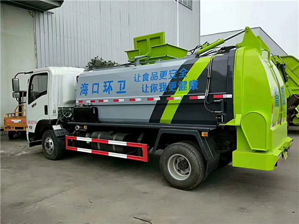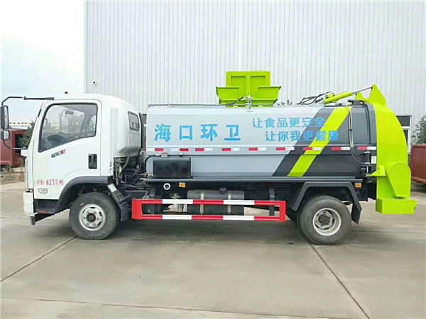后帶垃圾斗翻轉機構:這款餐廚垃圾車主要工作原理為清潔工將收集好的垃圾集中倒在垃圾翻轉斗里,當填料斗裝滿垃圾后,刮板打開,滑板帶動刮板一起向下移動,插入垃圾中進行破碎和首次壓縮,刮板向前回轉,進一步壓實垃圾,刮板到位后隨滑板向上移動,將垃圾壓實并裝填到垃圾箱中,然后回到起始位置。整個工作過程自動控制,在垃圾連續不斷的壓填時,推鏟在擠壓力的作用下,克服背壓逐步后退,實現垃圾雙向壓縮并均勻充滿整個垃圾箱。