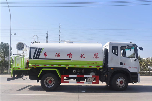 1、高壓水炮――位于東風D9國六14.5方噴霧車后工作平臺上,可360度全方位旋轉,可連續調節成:柱狀、開花狀、大雨、中雨、毛毛雨、半霧狀等水流形態,射程28米,可用于遠離沖洗建筑物、樹木、應急消防救火、重污染路面的定點清洗等。