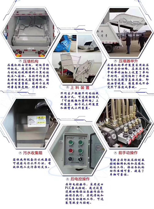 壓縮式垃圾車的使用作業控制盒分別安裝在駕駛室內和車尾,駕駛室內的作業控制盒可控制推擠卸料和選擇操作模式(如自動或手動),車尾的作業控制盒則控制壓填機構和翻桶機構的作業,使用操作十分方便。特別是在垃圾填埋場,作業人員無須下車即可完成卸料和污水排放。