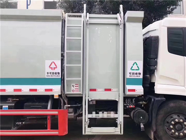 兩款壓縮餐廚垃圾車的卸載方式都是一樣的,都是通過壓縮廂內(nèi)的推盤推出達到卸載的目的。可將路邊垃圾桶內(nèi)垃圾收集入垃圾廂內(nèi),通過后壓縮裝置將垃圾車壓縮成塊運輸,節(jié)省了垃圾容積,加快了效率,沒有二次污染。