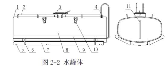 3、罐體 灑水車罐體結(jié)構(gòu),罐體為橢圓形或方形,用鋼板制成,整車罐體水倉為 2-3室,中間隔板下端有通孔,倉內(nèi)隔板具有防波作用。以減低汽車行駛時(shí)罐內(nèi)液體的沖擊。外表涂防銹漆 及裝飾漆。