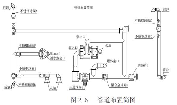 在灑水和澆灌花木時(shí),其操作程序是:調(diào)節(jié)三通球閥G到如圖位置(注意:三通球閥凹坑所對方向關(guān)閉),關(guān)閉鋁合金球閥H和消防栓I,打開不銹鋼球閥A、B、C、D、E,打開鋁合金球閥H,踏下離合,打開取力器開關(guān),慢慢松開離合(千萬不可過快,否則將會(huì)損壞取力器或變速箱),使水泵開始工作,即可向?qū)崿F(xiàn)灑水和澆灌花木的功能,停止工作后開關(guān)