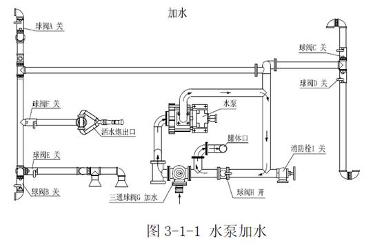 當(dāng)在野外自采水的情況下,水能通過水泵給罐內(nèi)供水,其操作程序是:在三通球閥G處接一膠管,調(diào)節(jié)三通球閥G到如圖位置(注意:三通球閥凹坑所對方向關(guān)閉),關(guān)閉不銹鋼球閥A、B、C、D、E、F和消防栓I,打開鋁合金球閥H,踏下離合,打開取力器開關(guān),慢慢松開離合(千萬不可過快,否則將會(huì)損壞取力器或變速箱),使水泵開始工作,即可向罐內(nèi)加水,停止工作后開關(guān)回位。