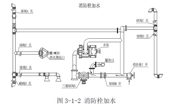 工作水路示意:水經(jīng)過消防栓開關(guān)I、鋁合金球閥H、水罐。(其中A、B、C、D、E、F、G、H關(guān)閉)。