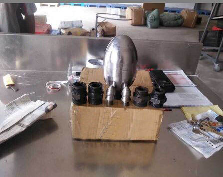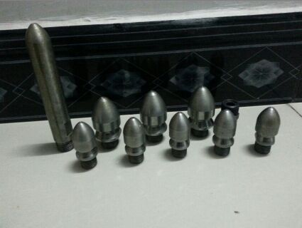 除了直噴頭以外,每個噴頭都有向后的6個噴射孔(一邊穿透、破碎、攪拌堵塞物,一邊推動噴頭和耐高壓水管前進),其中2、3、5、8號另外,還有一個前噴孔(穿刺堵塞物并作為導引孔)。