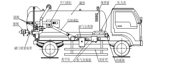 該車是由汽車底盤,取力器,傳動軸,真空吸污泵,壓力罐體,液壓部分,管網系統,真家壓力表,視糞窗,洗手裝置等組成,隨車配置大功率真空吸污泵和優質液壓系統,